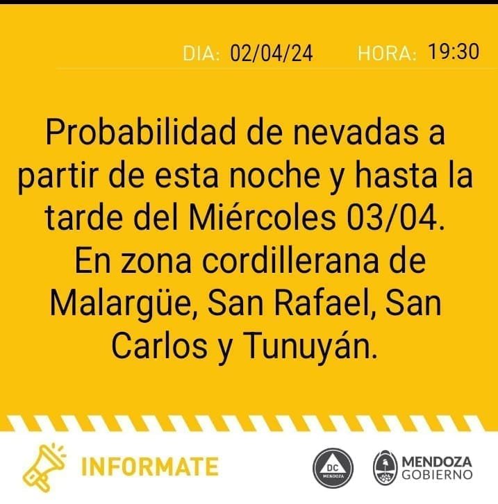Esto afectaría parte del Valle de Uco, ya que contempla, «zona cordillerana de San Carlos, Tunuyán» y al sur, también el departamento de Malargüe.