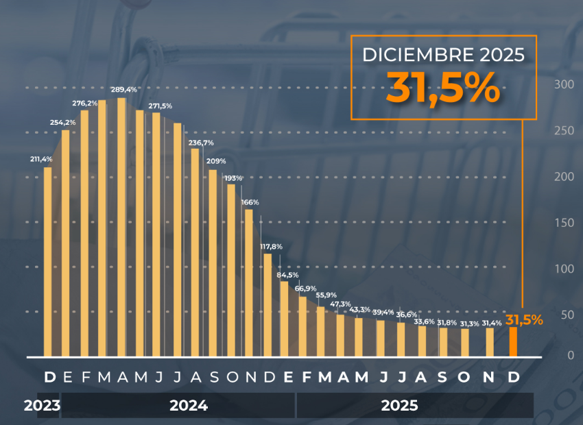 Al posar la lupa sobre el comportamiento anual, la inflación experimentó una reducción de 86,3 puntos porcentuales respecto a los 117,8% que se había registrado en 2024. El Presupuesto 2026 contempla un IPC de 10,1% para el año corriente, aunque las mediciones privadas estiman el doble.