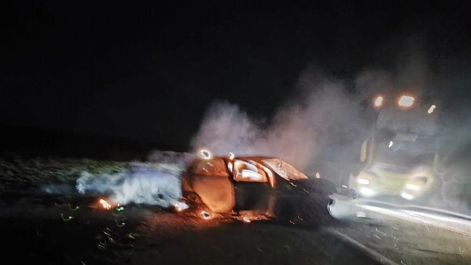 El hecho ocurrió alrededor de las 21.30, cuando la conductora de una Chevrolet Tracker, al parecer, rebasó la doble línea amarilla e impactó a un camión en el costado izquierdo produciéndose el vuelco del rodado menor y el incendio del mismo. Afortunadamente las ocupantes de la Tracker lograron salir prácticamente ilesas, antes que el vehículo se prendiera fuego.