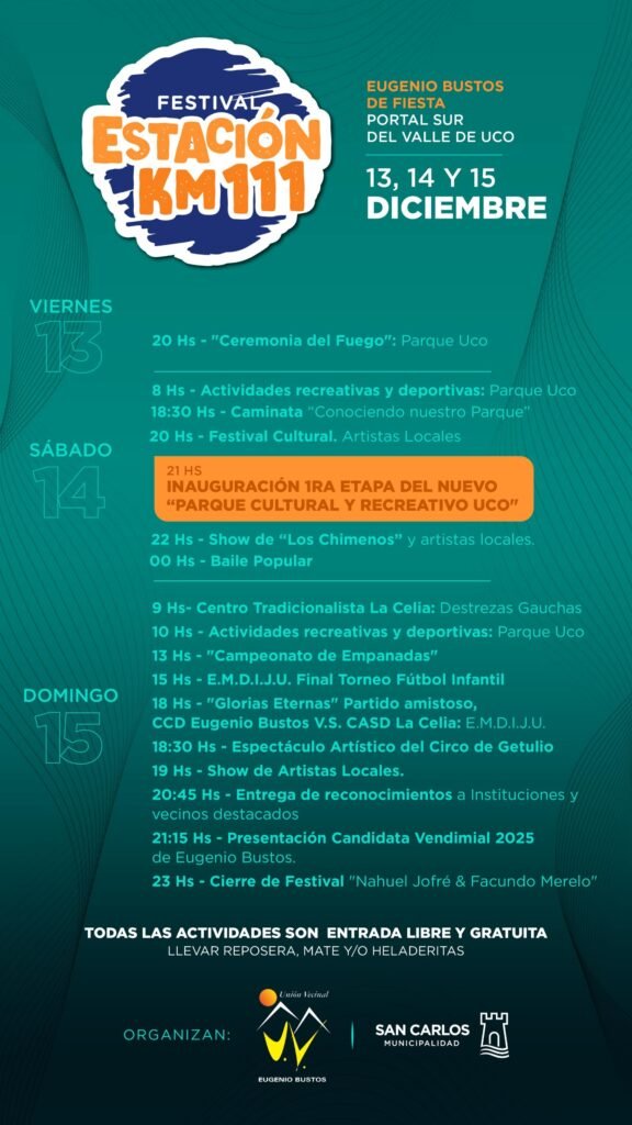 El próximo 13, 14 y 15 de diciembre, en el Parque Uco de Eugenio Bustos, San Carlos se realizará el Festival Estación MK 111.