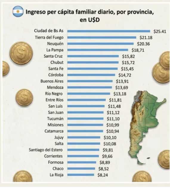La diferencia también se percibe en el ingreso diario. En CABA se superan los 25 dólares por día, mientras que en provincias del norte no se llega a los 9 dólares, lo que implica una brecha de más de tres veces. Esto impacta directamente en el bolsillo (en algunos distritos apenas alcanza para alimentos básicos), mientras que en otros se accede a una canasta más amplia. Mendoza, nuevamente, queda en un punto intermedio en ese esquema.