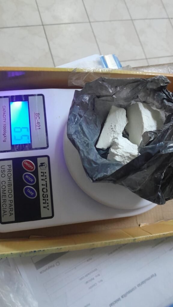 Al efectuar la requisa vehicular, los efectivos hallaron en el interior un bolso de mano que contenía una bolsa de nylon transparente con un envoltorio negro en cuyo interior había una sustancia blanquecina compactada, además de dos cartuchos calibre 9 mm.