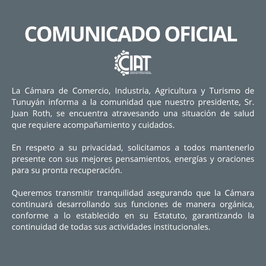 En las últimas horas, desde la Cámara de Comercio, Industria, Agricultura y Turismo difundió un comunicado oficial, «nuestro presidente se encuentra atravesando una situación de salud que requiere acompañamiento y cuidados»