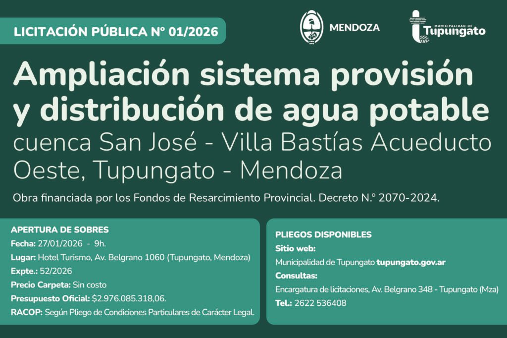 El acto administrativo de apertura de sobres será el martes 27 de enero, a las 9, en el Hotel Turismo de Tupungato. Este proceso marca el inicio formal de una obra que cuenta con un presupuesto oficial de $2.917.730.703 y que será financiada íntegramente con los Fondos del Resarcimiento Provincial.