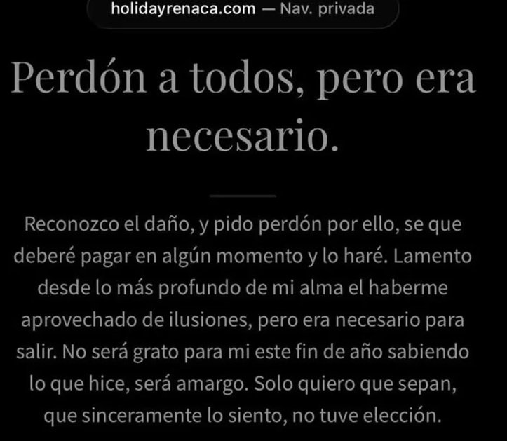 “Reconozco el daño y pido perdón por ello. Sé que deberé pagar en algún momento y lo haré. Lamento desde lo más profundo de mi alma el haberme aprovechado de ilusiones, pero era necesario para salir”, agregó.