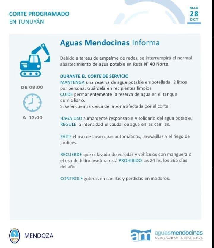 Vecinos de la zona norte de Tunuyán deberán tener en cuenta que este martes 28 de octubre se realizará un corte programado de agua potable debido a trabajos de empalme en la red que lleva adelante Aguas Mendocinas.