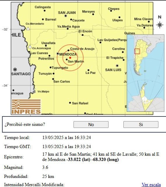 De acuerdo con el reporte preliminar del Instituto Nacional de Prevención Sísmica (Inpres), el primero, tuvo epicentro 23 kilómetros al Este de San Martín y 61 kilómetros al Este de la Ciudad de Mendoza.