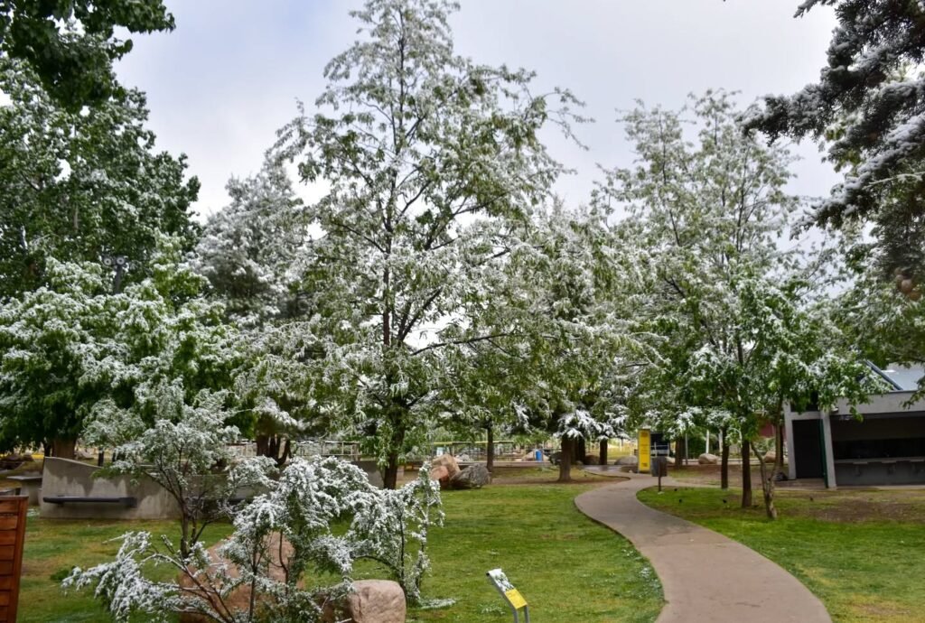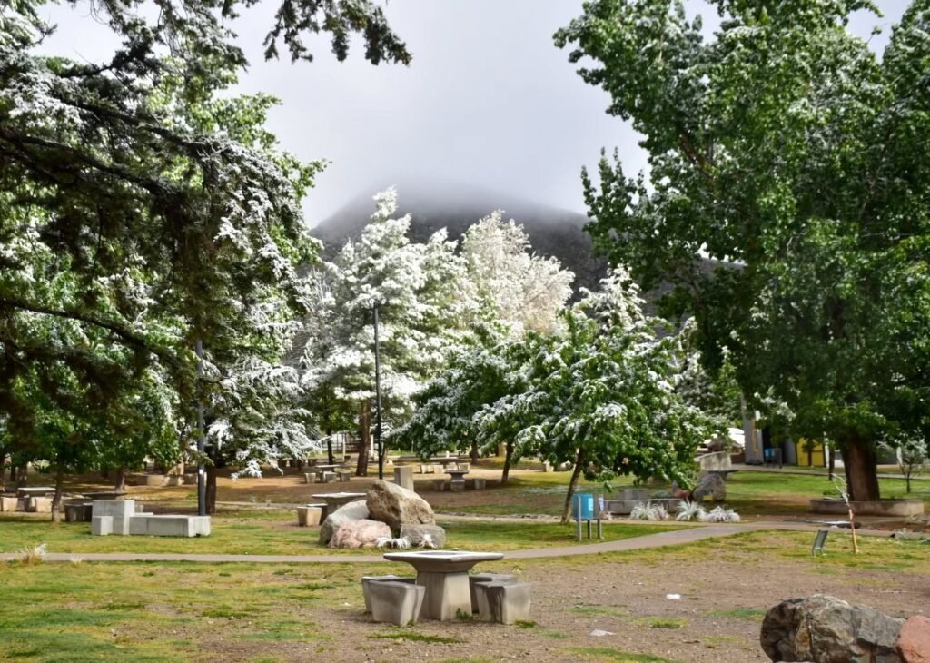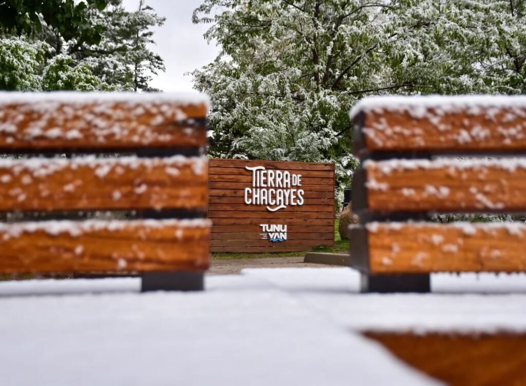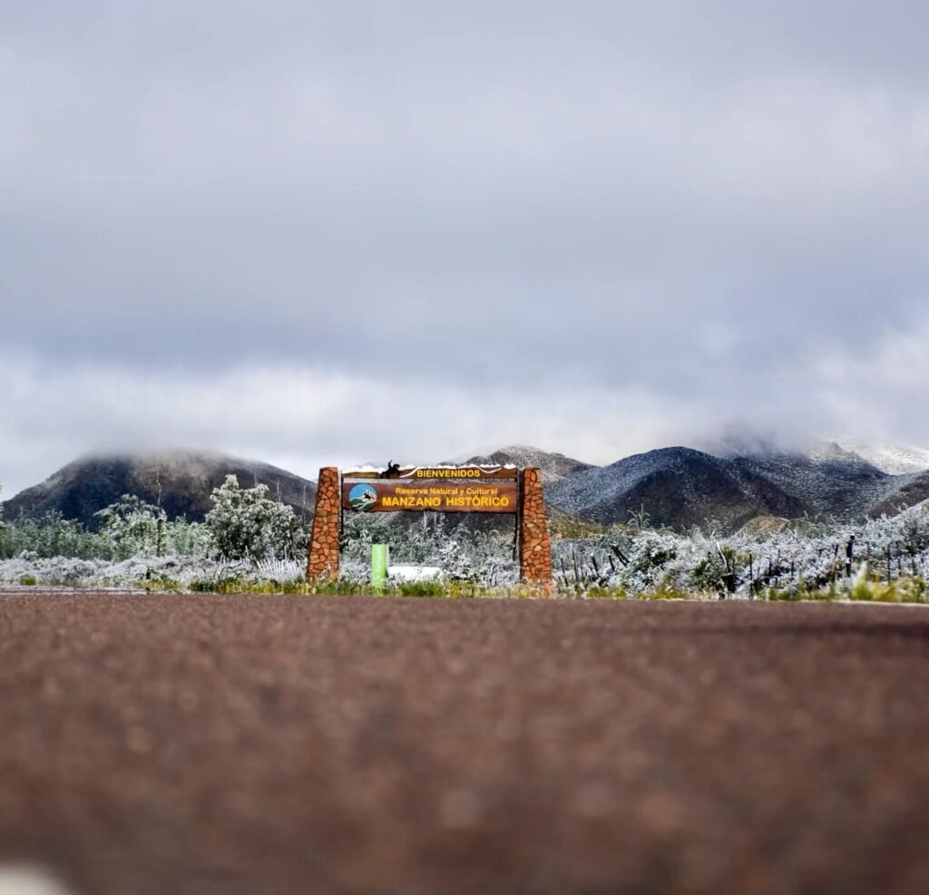 Ayer, el Manzano Histórico se vistió de blanco, una leve nevada dejó una ligera capa de nieve, especialmente sobre los árboles, embelleciendo aún más el paisaje.