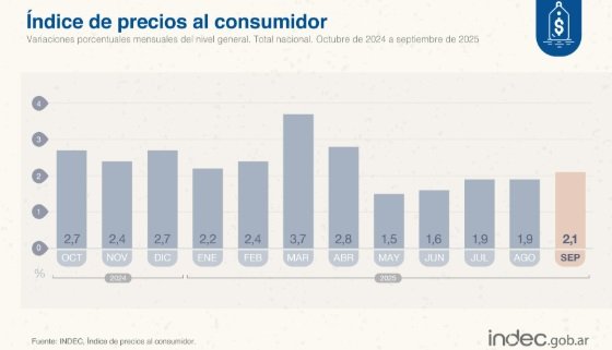 El Instituto Nacional de Estadística y Censos (Indec) dio a conocer este martes el dato de inflación correspondiente al mes de septiembre, que se ubicó en el 2,1%, por encima del nivel de agosto (1,9%).