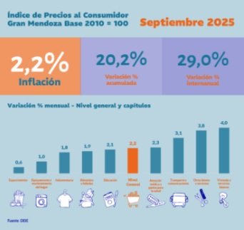 La inflación en Mendoza fue de un 2,2% en septiembre, una cifra apenas por encima del promedio nacional medido por el Instituto Nacional de Estadísticas y Censos (2,1%). De esta manera, durante los primeros nueve meses del año, el aumento del Índice de Precios al Consumidor local se ubica en 20,2%.