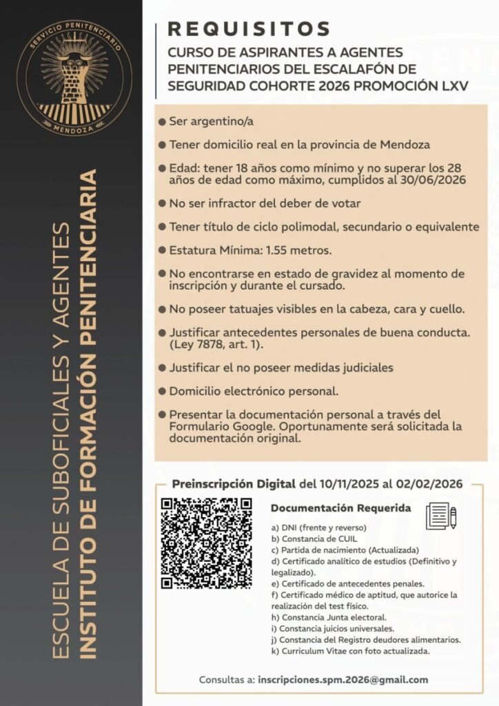 El Servicio Penitenciario de la provincia continúa con las inscripciones correspondientes al Curso de Aspirantes a Agentes Penitenciarios del Escalafón de Seguridad, cohorte 2026, promoción LXV. Se están desarrollando de forma on-line, para que quienes deseen formar parte puedan enviar toda la documentación requerida, escaneando un código QR que los llevará a completar un formulario digital.