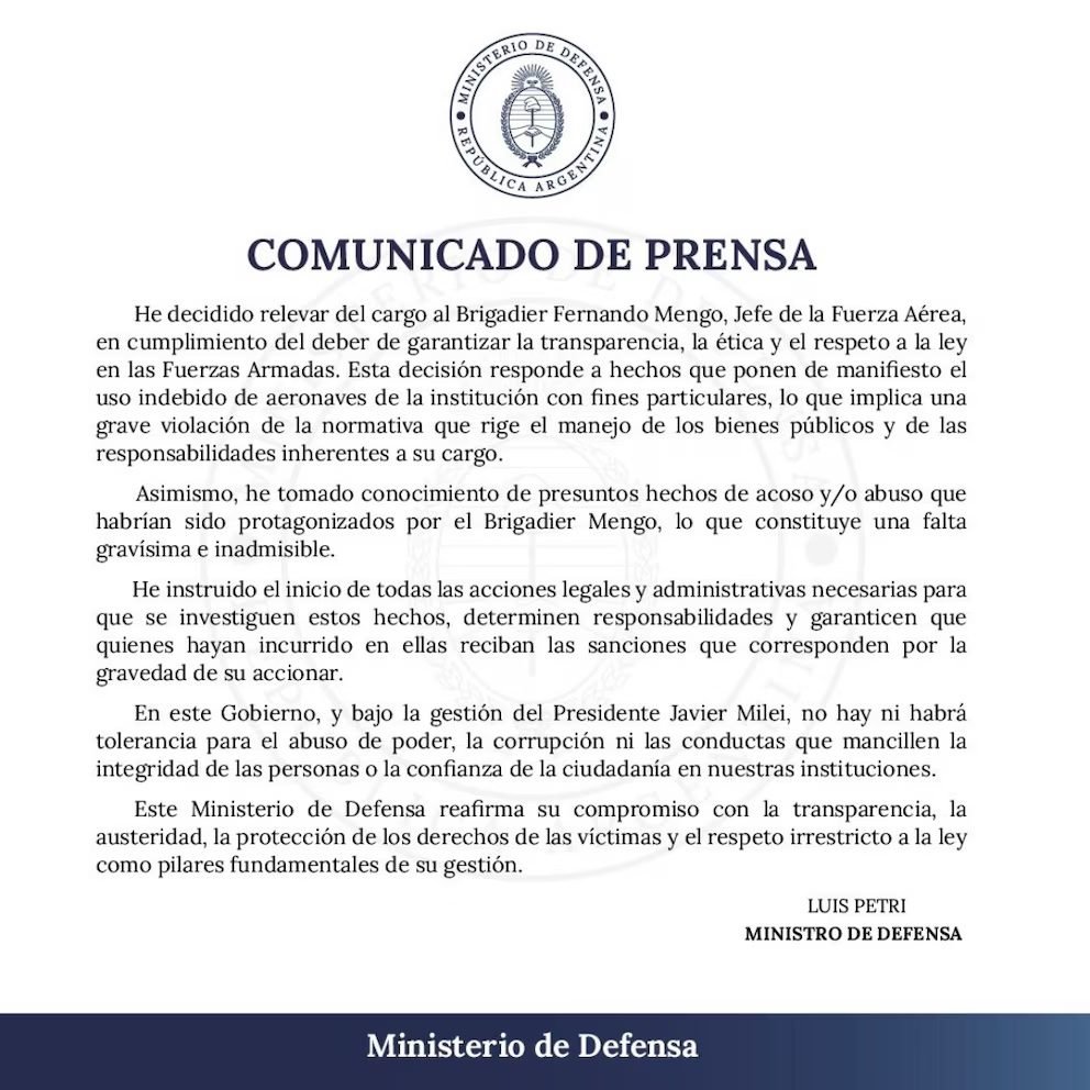 He decidido relevar del cargo al Brigadier Fernando Mengo, Jefe de la Fuerza Aérea, en cumplimiento del deber de garantizar la transparencia, la ética y el respeto a la ley en las Fuerzas Armadas. Esta decisión responde a hechos que ponen de manifiesto el uso indebido de aeronaves de la institución con fines particulares, lo que implica una grave violación de la normativa que rige el manejo de los bienes públicos y de las responsabilidades inherentes a su cargo”, señala el comunicado oficial del Ministerio de Defensa.