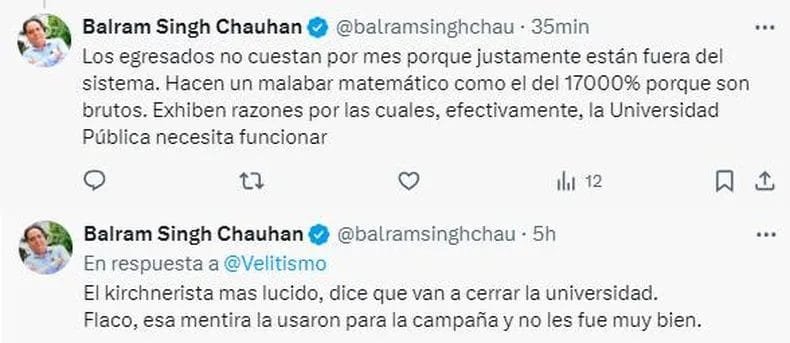 Ayer, el día de la Marcha Federal contra el veto de Milei, tuiteros indios se manifestaron contra la marcha. «Los egresados no cuestan por mes porque justamente están fuera del sistema. Hacen un malabar matemático como el del 17000% porque son brutos. Exhiben razones por las cuales, efectivamente, la Universidad Pública necesita funcionar«, escribió en un español algo torpe. Para luego cargar contra la marcha.