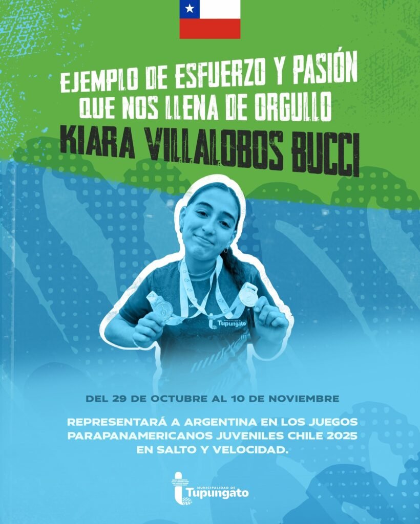 Kiara Villalobos Bucci, destacada atleta del departamento de Tupungato, ha conseguido la clasificación para representar a Argentina en los 𝗝𝘂𝗲𝗴𝗼𝘀 𝗣𝗮𝗿𝗮𝗽𝗮𝗻𝗮𝗺𝗲𝗿𝗶𝗰𝗮𝗻𝗼𝘀 𝗝𝘂𝘃𝗲𝗻𝗶𝗹𝗲𝘀 𝗖𝗵𝗶𝗹𝗲 𝟮𝟬𝟮𝟱, en las desafiantes pruebas de salto y velocidad.