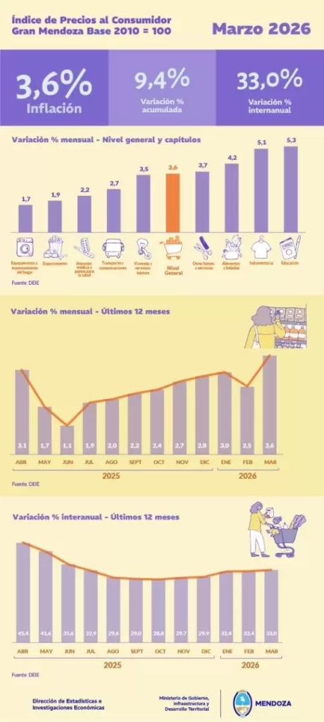 En términos interanuales, la inflación en Mendoza alcanzó el 33%, considerando el período comprendido entre abril de 2025 y marzo de 2026.