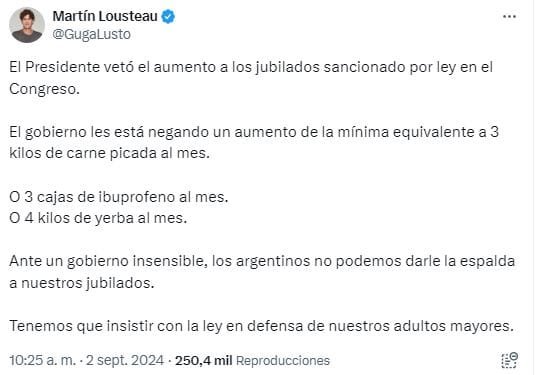 Además, publicó: “El Presidente vetó el aumento a los jubilados sancionado por ley en el Congreso. El gobierno les está negando un aumento de la mínima equivalente a tres kilos de carne picada al mes. O tres cajas de ibuprofeno al mes. O cuatro kilos de yerba al mes”.