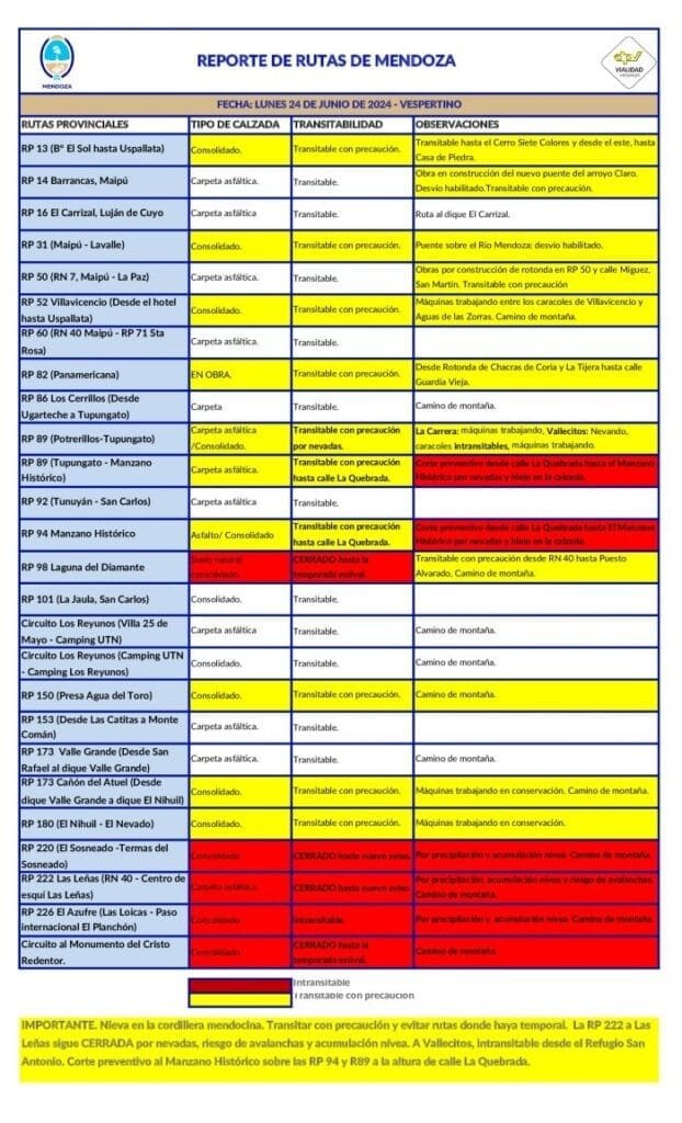En tanto el estado de todas las rutas que surcan Mendoza es el siguiente: