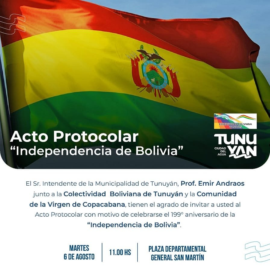 La Municipalidad de Tunuyán organizó para mañana, martes 6, un acto por la celebración del “199° Aniversario de la fundación de la República de Bolivia”.