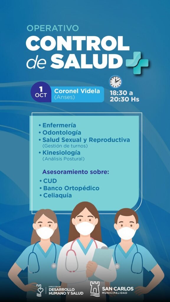 La Municipalidad de San Carlos informó que mañana, miércoles 01 de octubre de 18:30 a 20:30 horas, se realizará un operativo de salud en Calle Coronel Videla.