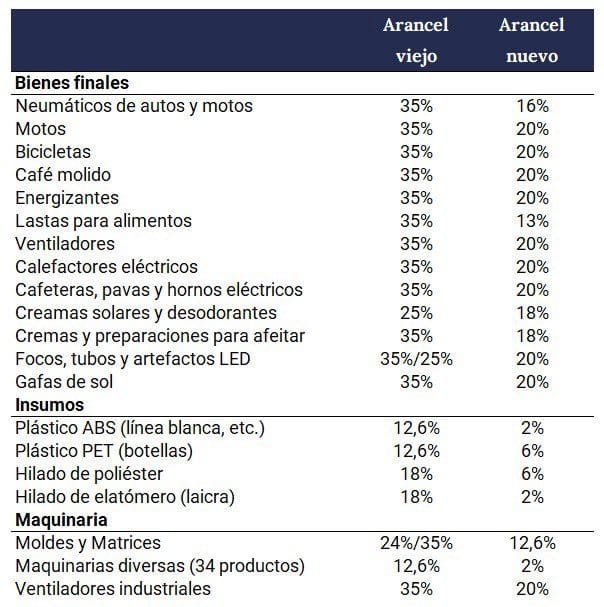 Entre todo el listado de bienes impactados por la baja impositiva se encuentran las latas para alimentos, el plástico para botellas, la licra y el poliéster de la industria textil, neumáticos y algunos electrodomésticos como luces LED, cafeteras, pavas y hornos eléctricos. Dada la cercanía con la vida cotidiana de estos productos, el Gobierno aguarda que esto se sienta en el bolsillo con precios más bajos.