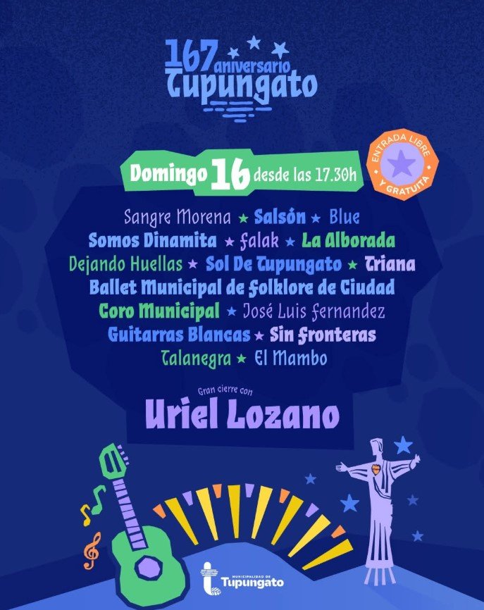 Este domingo, las actividades comienzan a las 18:00, con nuevas presentaciones de ballets locales y grupos musicales, que irán creando el clima festivo con el que, al momento del cierre, subirá al escenario Uriel Lozano, para entregar toda la fuerza de su música.