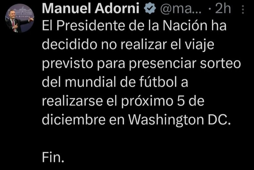 Luego, fue Manuel Adorni quien utilizó la red social X para anunciar: «El Presidente de la Nación ha decidido no realizar el viaje previsto para presenciar el sorteo del Mundial de fútbol a realizarse el próximo 5 de diciembre en Washington DC».