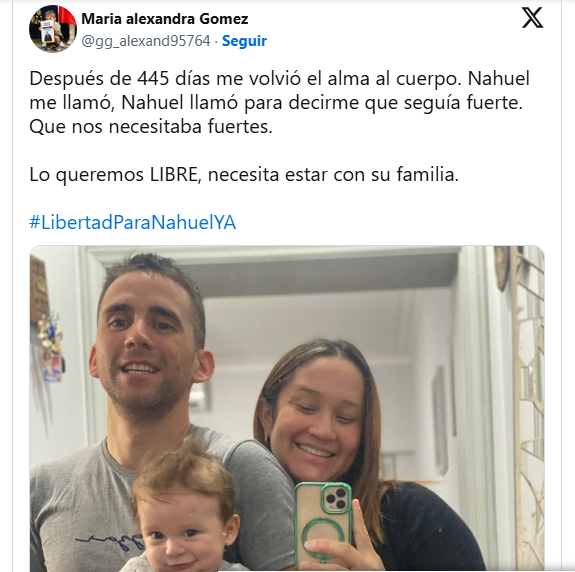“Después de 445 días me volvió el alma al cuerpo. Nahuel me llamó, Nahuel llamó para decirme que seguía fuerte. Que nos necesitaba fuertes”, expresó Gómez en un mensaje que difundió por la red social X.