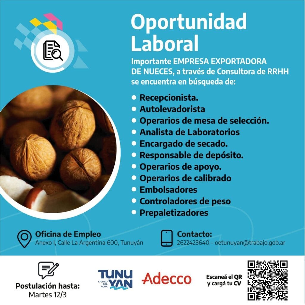 Desde el municipio de Tunuyán, a través de la Oficina de Empleo se difundió una amplia convocatoria para cubrir puestos de trabajo disponibles en una empresa exportadora.