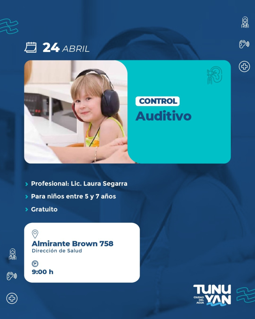La Dirección de Desarrollo Humano y Salud de la Municipalidad de Tunuyán comunica que el próximo 24 de abril se llevará a cabo un control auditivo gratuito destinado a niños y niñas de 5 a 7 años.