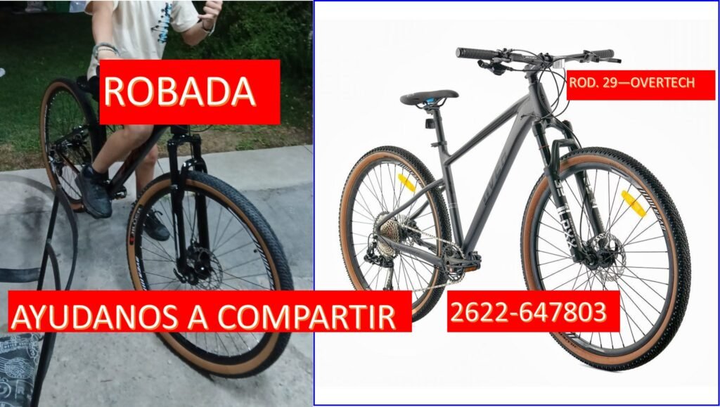 Se trata de una bicicleta rodado 29, marca Overtech, de color negro y en sus ruedas detalles en marrón. La bicicleta pertenece a un menor de edad y hace muy pocos meses fue comprada con mucho esfuerzo por su madre para realizarle un regalo. Más allá de su valor económico, tiene un gran valor sentimental para la familia afectada.