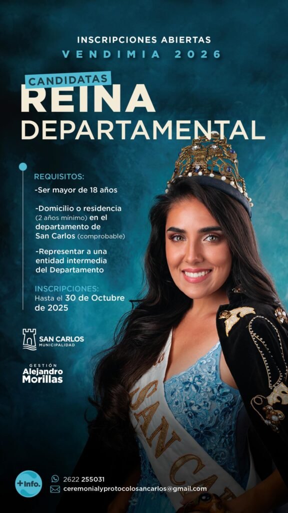 El departamento de San Carlos anunció que se encuentran abiertas las inscripciones para todas las jóvenes interesadas a postularse como reina de la Vendimia 2026