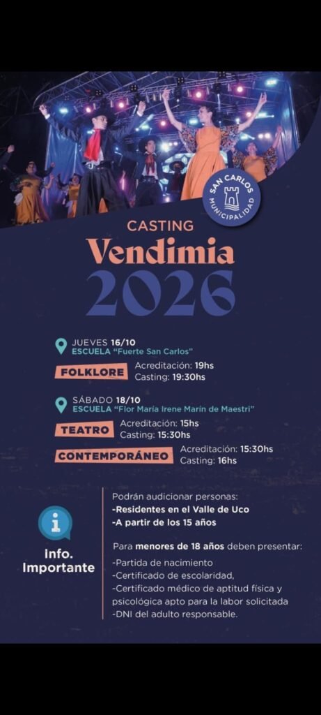 Este jueves 16 de octubre en la escuela Fuerte San Carlos desde las 19 serán las acreditaciones y a las 19:30 se dará inicio al casting de Folklore.