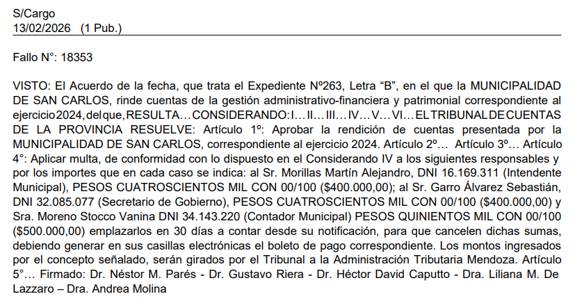 En este escenario, la gestión de San Carlos queda en una zona de tensión entre hechos comprobados y versiones en disputa. La multa aplicada por el organismo de control marca un antecedente concreto, mientras que las dudas sobre otras contrataciones abren una línea de investigación que todavía no encuentra respaldo documental.