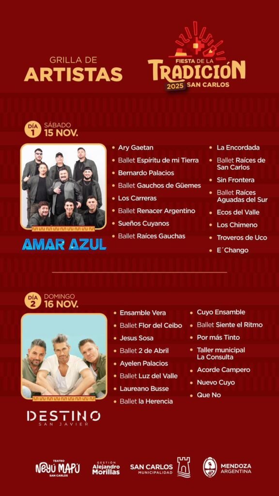 El sábado 15 de noviembre, la jornada inaugural tendrá como número central a Amar Azul, una de las bandas más populares de la movida tropical. Además, se presentarán Ary Gaetan, Bernardo Palacios, Los Carreras, Sueños Cuyanos, Sin Frontera, Ecos del Valle, Los Chimeno, Troveros de Uco y E’Chango, junto a una nutrida participación de ballets folklóricos como Espíritu de mi Tierra, Gauchos de Güemes, Renacer Argentino, Raíces Gauchas, Raíces de San Carlos y Raíces Aguadas del Sur, entre otros.