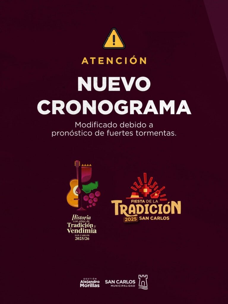 El intendente de San Carlos, Alejandro Morillas, informó que debido a los pronósticos de tormenta, se decidió reprogramar la agenda de Vendimia y la Fiesta de la Tradición.