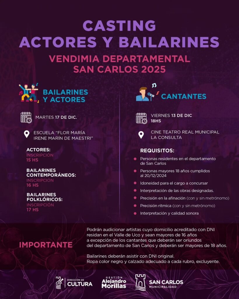 Desde la comuna, informaron que Bailarines y actores tendrán su casting el próximo martes 17 de diciembre en la escuela Flor María Irene de Maestri.