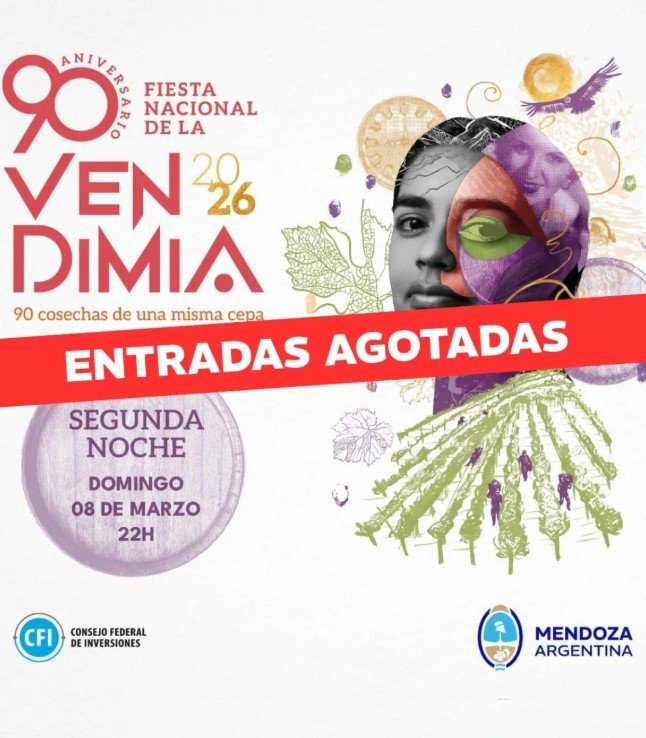 La segunda noche de la Fiesta Nacional de la Vendimia 2026 ya no cuenta con entradas disponibles. Este lunes, la Subsecretaría de Cultura confirmó que el cupo para el espectáculo “90 cosechas de una misma cepa” del domingo 8 de marzo se completó a los pocos minutos de iniciada la venta online. Esa jornada, que incluye la primera repetición del Acto Central en el Teatro Griego Frank Romero Day, tendrá como cierre la actuación del músico Luciano Pereyra.