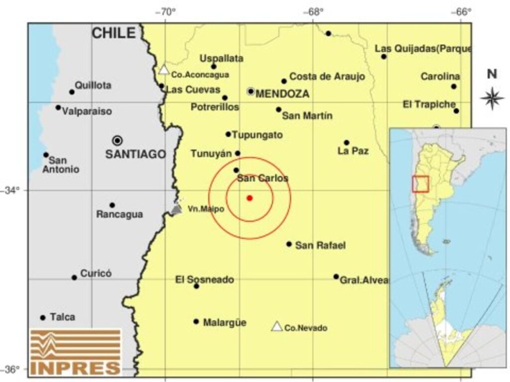 Según los datos del INPRES, el movimiento se registró a 135 km al S de Mendoza; 250 km al O de San Luis; 39 km al SE de San Carlos -34.09 (lat) -68.86 (long).