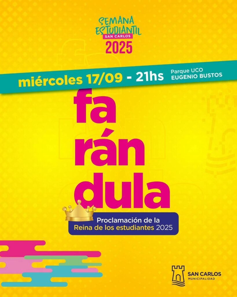 Luego de que el pasado fin de semana, no se pudiera realizar, hoy las escuelas del Departamento desfilarán con los carros, barras, mascotas y sus embajadoras. Al finalizar se realizará la elección y coronación de la nueva Reina de los Estudiantes de San Carlos.