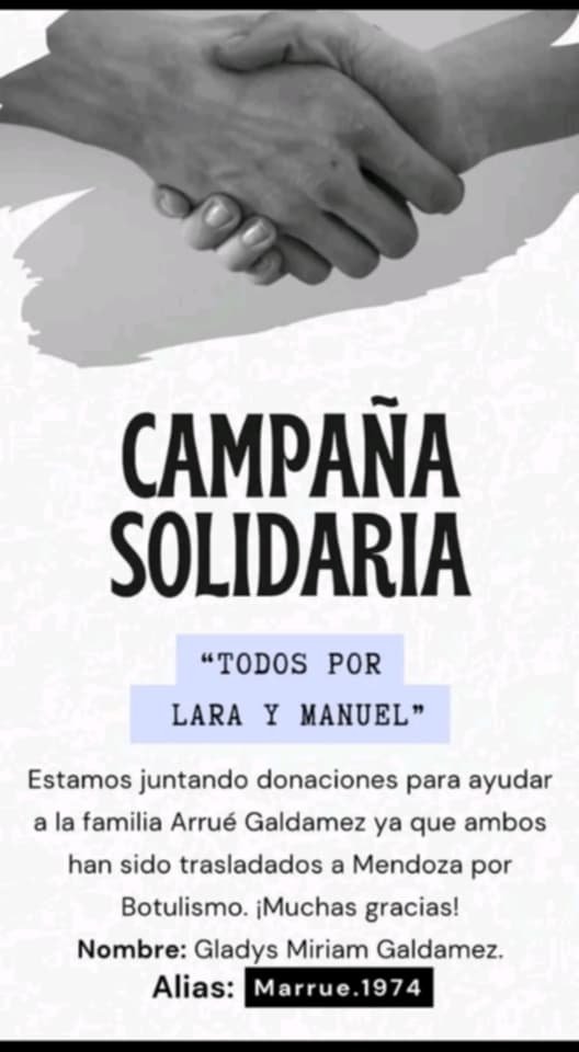 Familiares y amigos iniciaron una campaña solidaria para ayudar con los traslados y gastos hacia ciudad, quien se encarga primordialmente de los cuidados es Miriam, esposa de Manuel y mamá de Lara. En redes difundieron un ALIAS: Marrue.1974 a nombre de Gladys Miram Galdame. Quienes deseen realizar su donación, será de mucha ayuda para la familia.