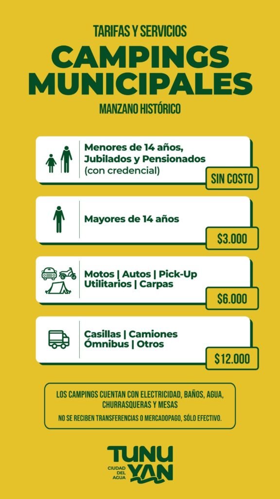 La Municipalidad de Tunuyán dio a conocer el cuadro de tarifas y servicios vigentes de los campings municipales ubicados en Manzano Histórico, uno de los destinos más elegidos por vecinos y turistas durante la temporada de verano.