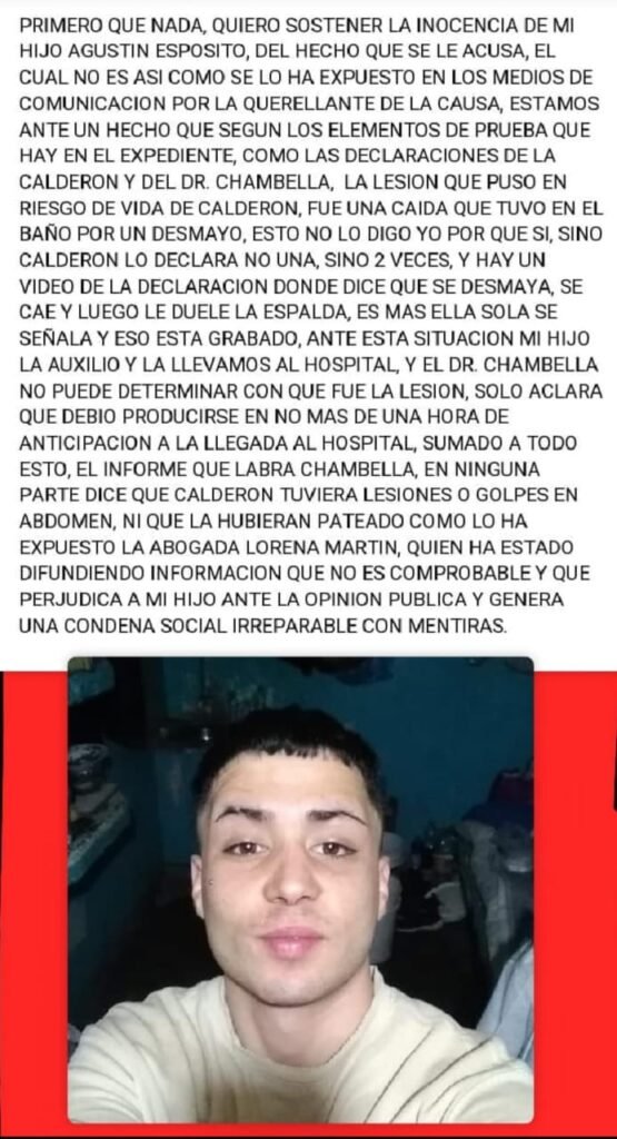 La familia Espósito Veliz también realizó su descargo en redes sociales y medios de comunicación, dando su versión de los hechos. Según su exposición, Agustín es inocente, actualmente transitan un expediente judicial, en el cual no hay pruebas y las declaraciones de la víctima no coinciden con lo expuesto en los medios. La familia del acusado, niega que el joven halla golpeado a su novia y que el golpe que sufre se da producto de un desmayo en el baño. Además, denuncian que la justicia no le ha brindado la posibilidad de declaración al acusado.