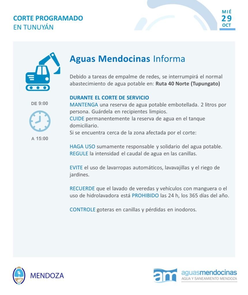 Aguas Mendocinas informó que este miércoles 29 de octubre se realizará un corte programado en el servicio de agua potable en Tunuyán, debido a tareas de empalme de redes. La interrupción afectará a los usuarios ubicados en la zona de Ruta 40 Norte (Tupungato), y se extenderá desde las 9 hasta las 15 horas.