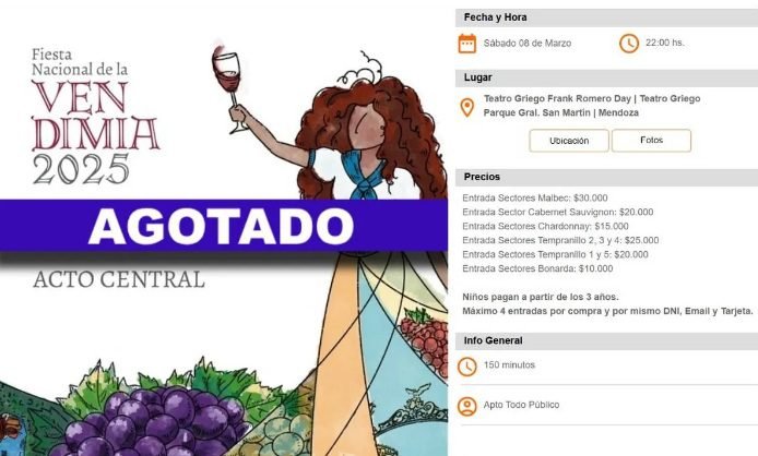 Duraron poco las localidades del Acto Central de la Fiesta Nacional de la Vendimia: en pocas horas se agotaron las entradas para disfrutar el 8 de marzo del espectáculo «Guardiana del vino eterno», además de la elección y coronación de la nueva soberana nacional. Las entradas fueron puestas a la venta únicamente a través de la plataforma entradaweb.com.