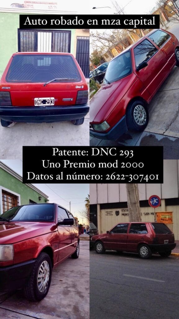 Dejó su vehículo estacionado en calle Alberdi al 455 de la capital mendocina y se lo robaron. Se trata de vehículo Fiat Uno patente DNC 293.