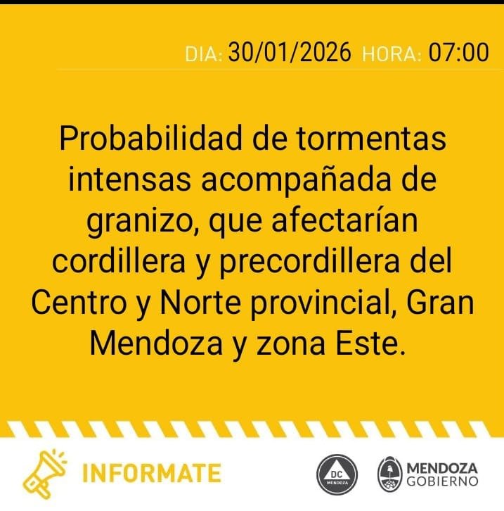 Contingencias Climáticas informó quw este viernes se presentará caluroso con nubosidad variable, inestable con tormentas de intensidad moderada a severa. Probabilidad de granizo y vientos moderados del sector sur. Máxima: 34 °C.